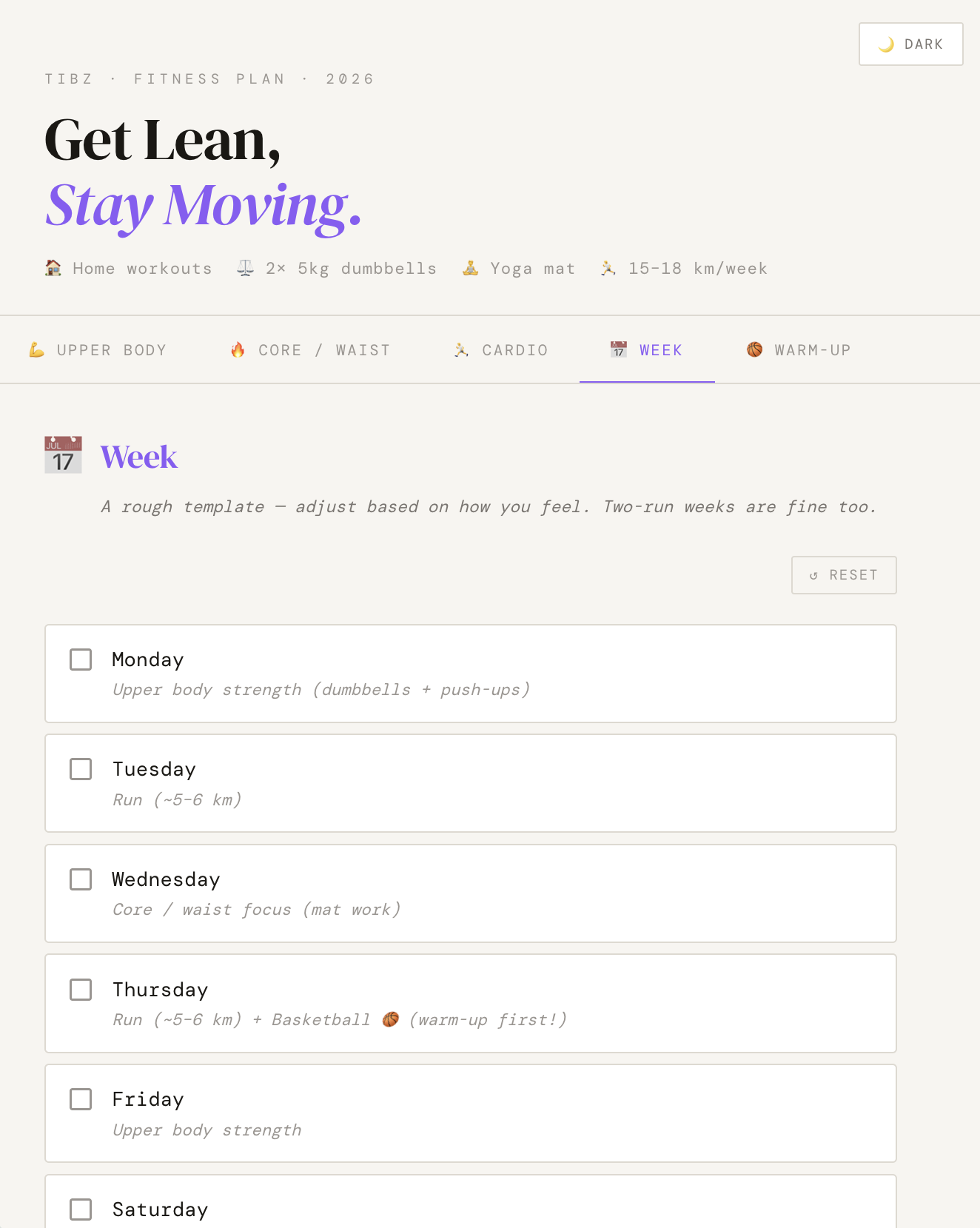 —## And finally, fitnessI run a few times a week. I play basketball on Thursdays. I have a yoga mat and two dumbbells at home. That’s the full setup.I wanted a weekly routine that actually reflected my life — not some generic program assuming I have a gym, infinite time, or perfect knees. I described my habits, my goals (upper body improvements, building running volume gradually, staying knee-conscious), and what I was working with. The plan I got back was something I could realistically follow, which is rare.I’ve used it more consistently than anything else I’ve tried. Probably because it was built around my actual situation.